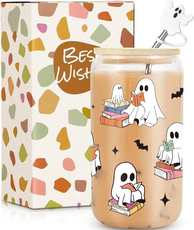 Ghost Reader Halloween Cup, Cute Spooky Gifts for Book Lovers Women, 16 oz Iced Coffee Tumbler Cup w/Lids Straws, Book Themed Bookworm Librarian Bookish Reading Halloween Gifts Boo Basket Gift