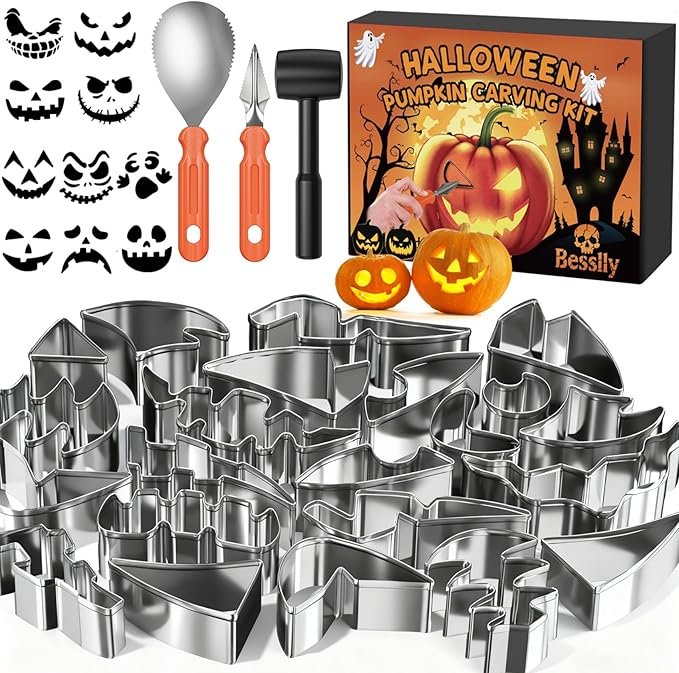 33PCS Halloween Pumpkin Carving Kit, 20 PCS Stainless Steel Professional Pumpkin Carving Stencils, 3 Durable Pumpkins Carving Tools, 10 Stickers for Kids Adults Halloween Decorations Safe Easy Fun