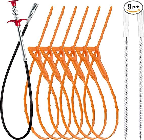 35.5inch Drain Clog Remover(1pcs), 25inch Drain Snake Hair Remover(6pcs) & Cleaning Brush(2pcs), Hair Catcher Drain Auger Cleaner Tool Set For Toilet, Kitchen Sink, Bathroom Tub, Sewer, 9 Pack