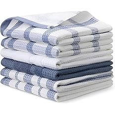 Amazon Basics Organic Cotton Waffle Kitchen Dish Towels – Ultra Absorbent, Quick Drying, Lint-Free, 15 x 25 inches, 6-Pack (4 Navy Strip/Checker, 1 White, 1 Solid Navy)